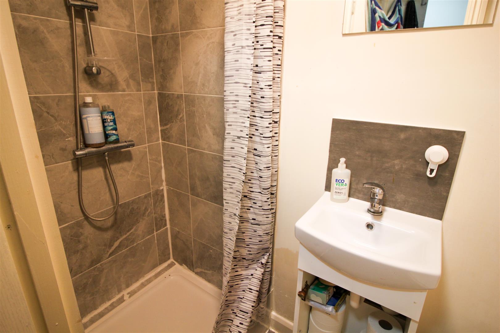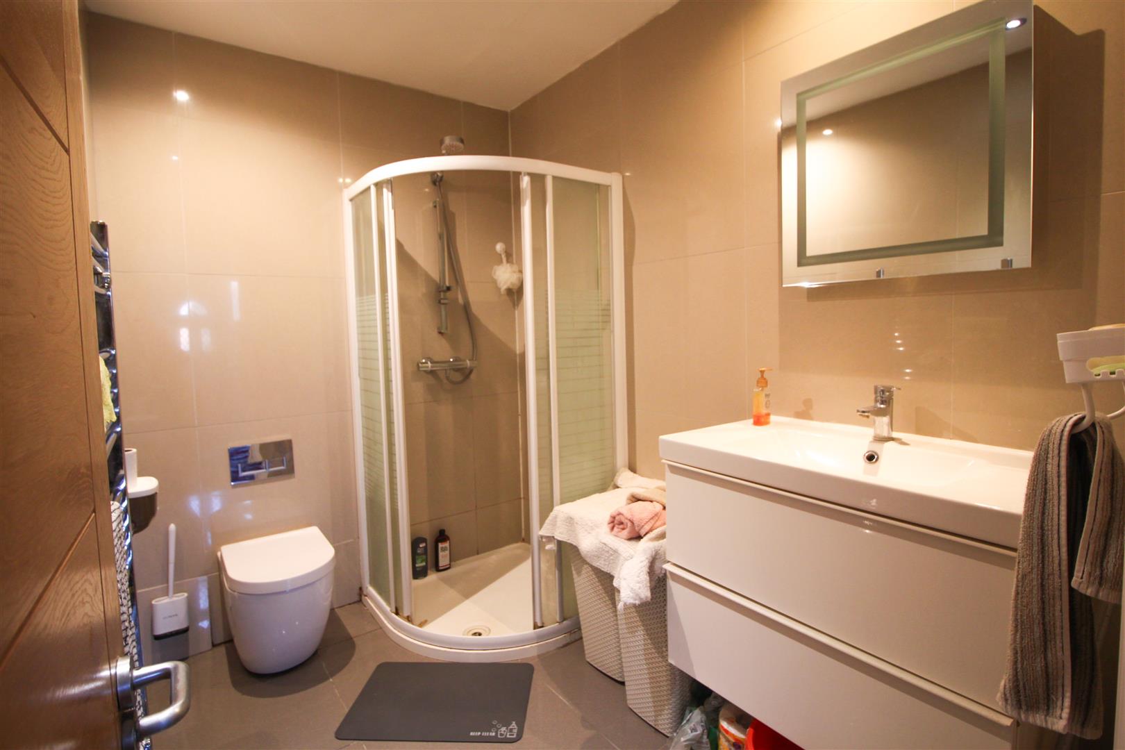Full tiled walls and floors, chrome heated towel rail, inset spotlights, wash hand basin with mixer taps, shower cubical with shower attachment, low level WC
