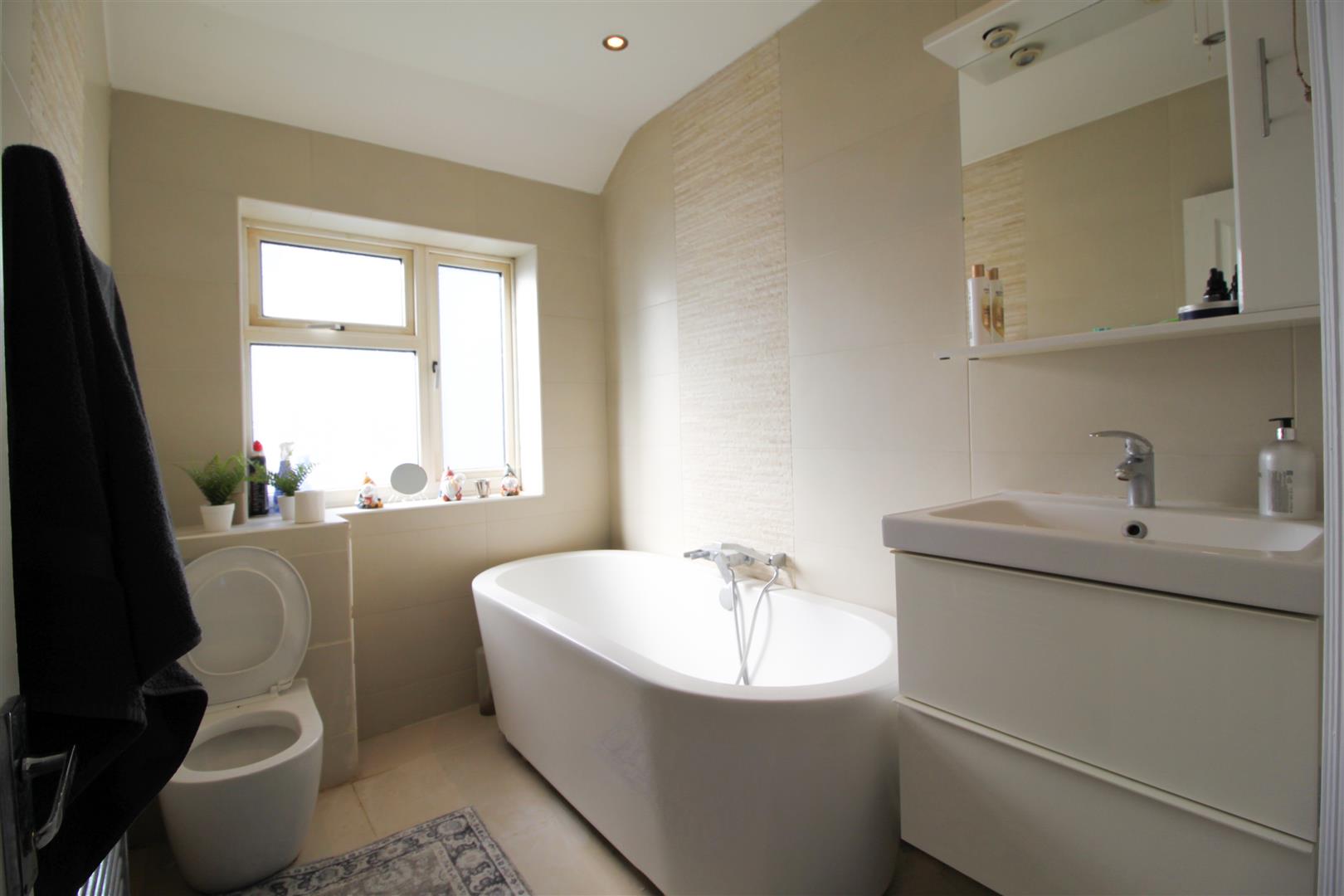 Fully tiled walls and floors, low level WC, vanity wash hand basin with mixer taps, panel enclosed bath, chrome heated towel rail, inset spotlights