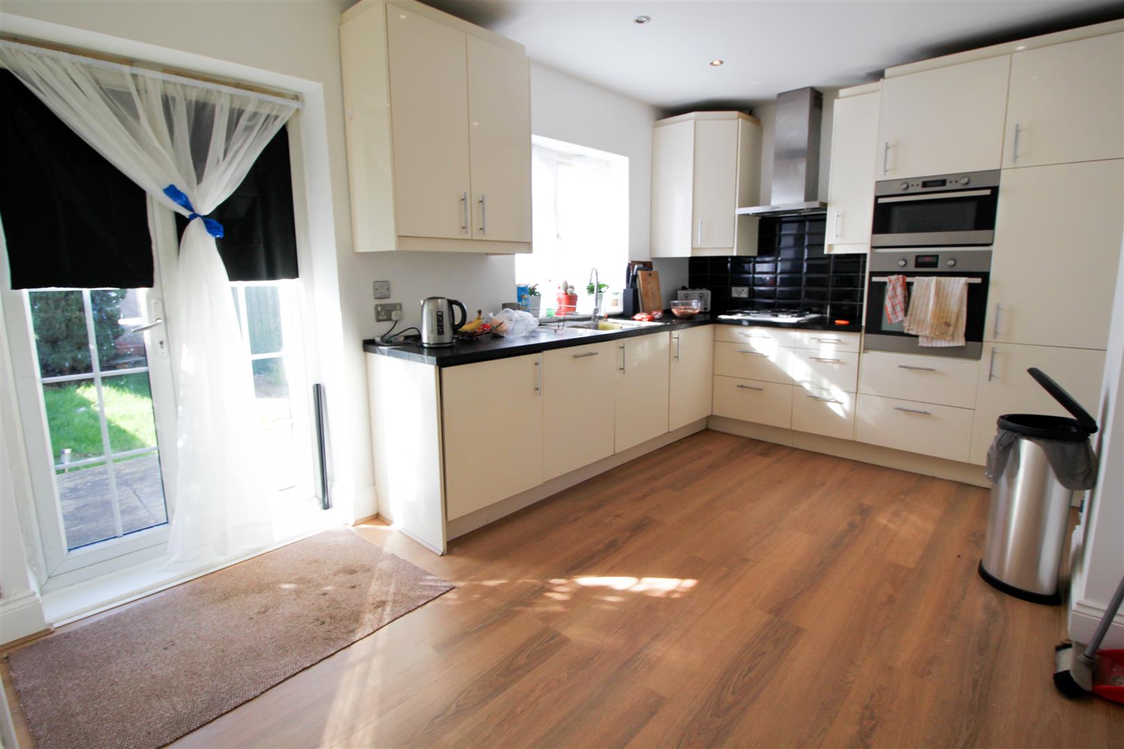 Wood laminate floors, inset spotlights, eye and base level storage units, four ring gas hob with over head extractor hood, integrated double oven and grill, single drainer stainless steel sink unit with mixer taps, power points, double glazed windows to rear, double glazed double doors to rear