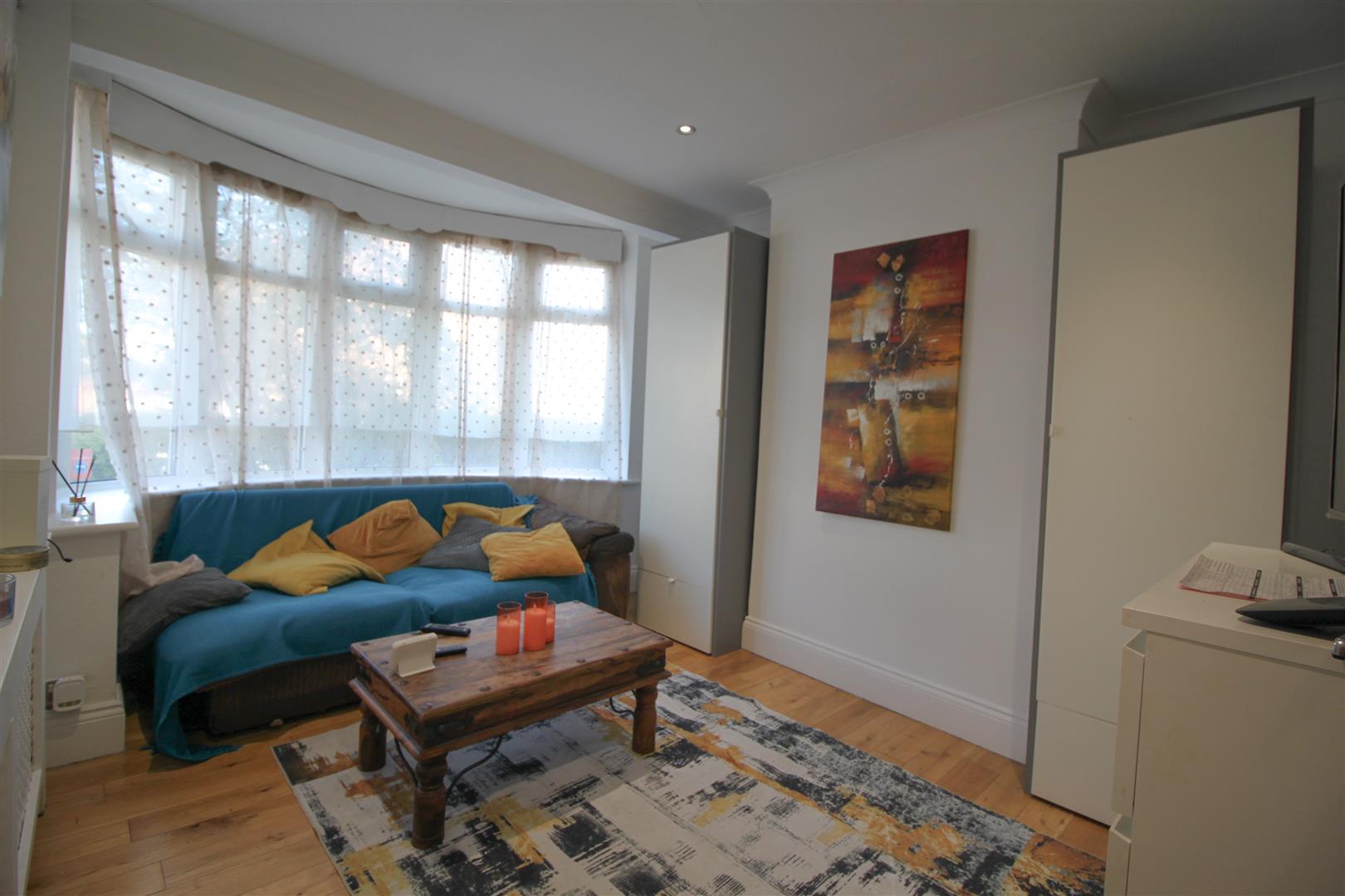Wood laminate floors, power points, double glazed bay windows to front, inset spotlights, radiator