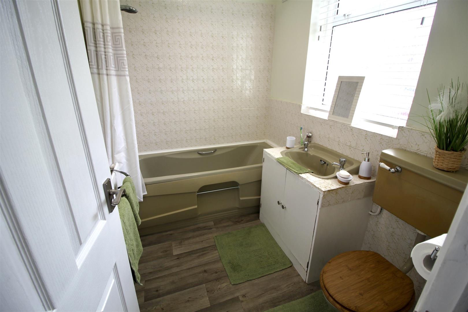 Panel enclosed bath with mixer taps and shower attachment, half tiled walls, vanity unit wash hand basin, low-level WC, radiator, double glazed window to side.