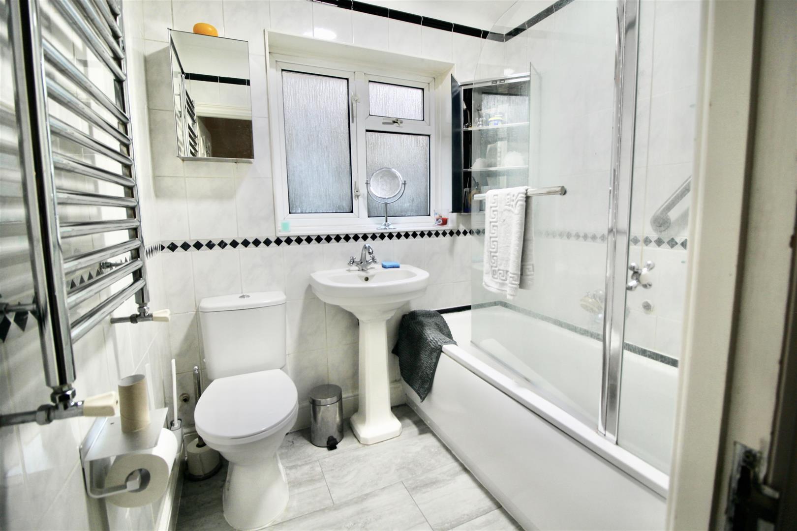 Panel enclosed bath with shower screen, wall mounted shower controls, wash nah basin, low level wc, double glazed window to rear, tiled walls