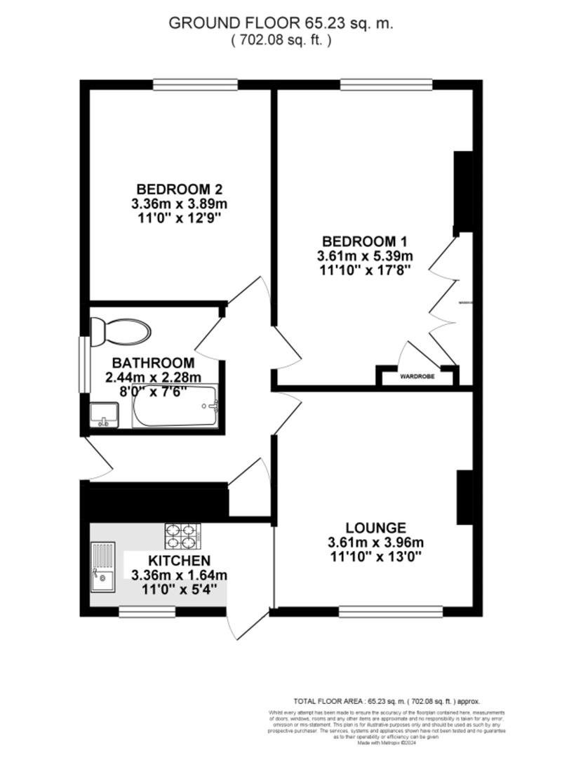 Modern range of iron and base level storage units, space and plumbing for washing machine, built in electric oven and 4 ring electric hob, fridge freezer, double glazed window and door to rear garden