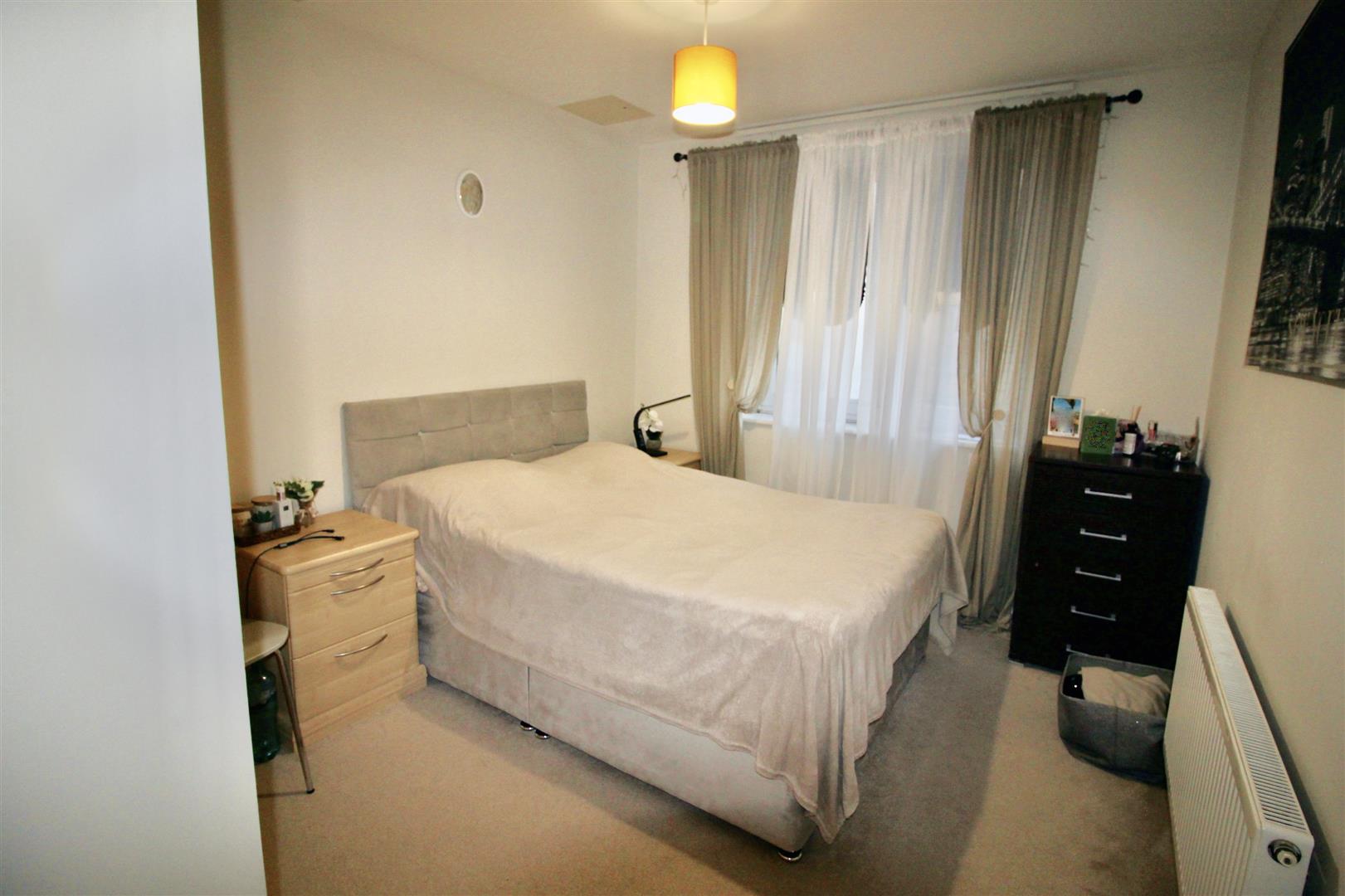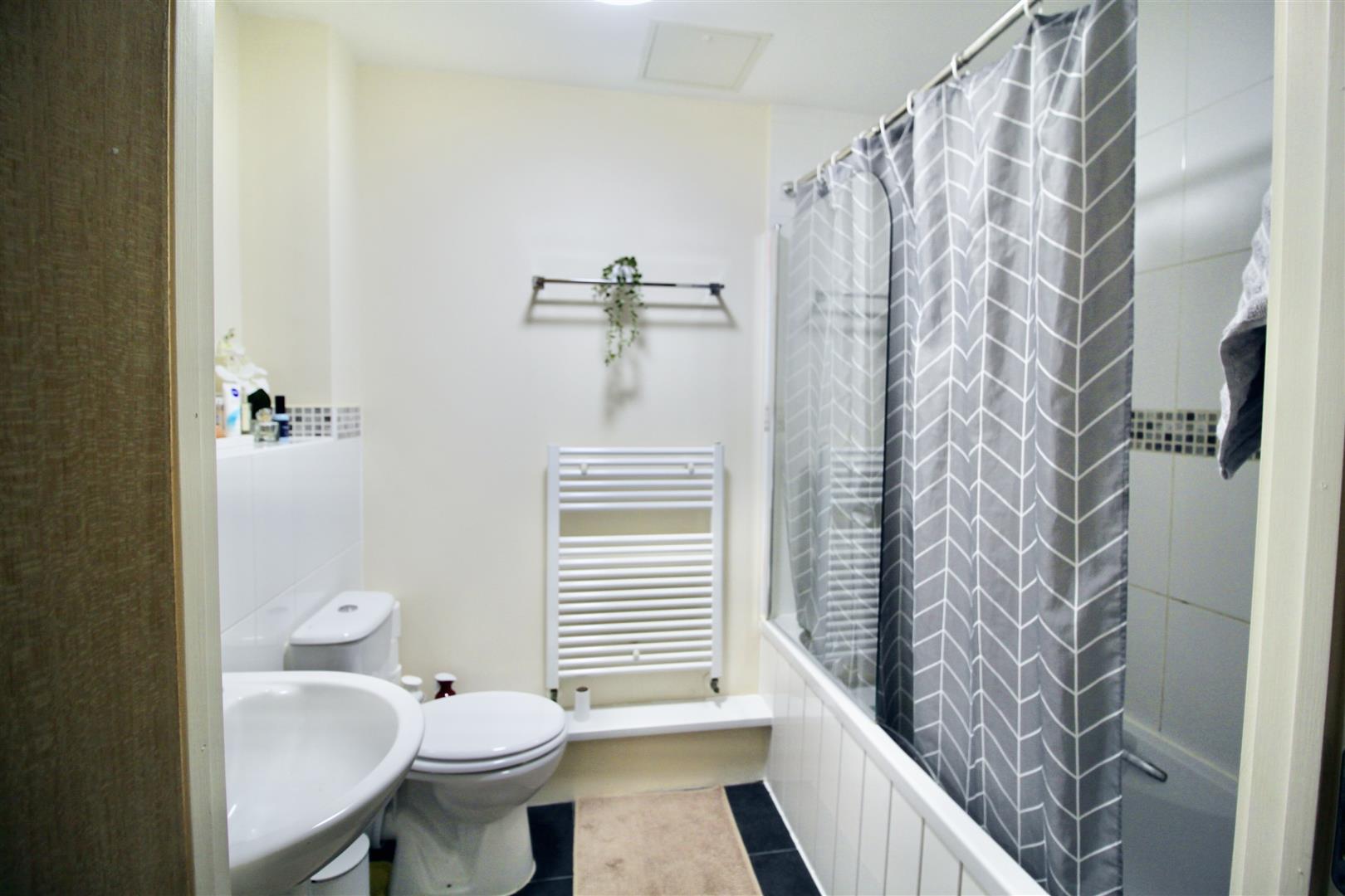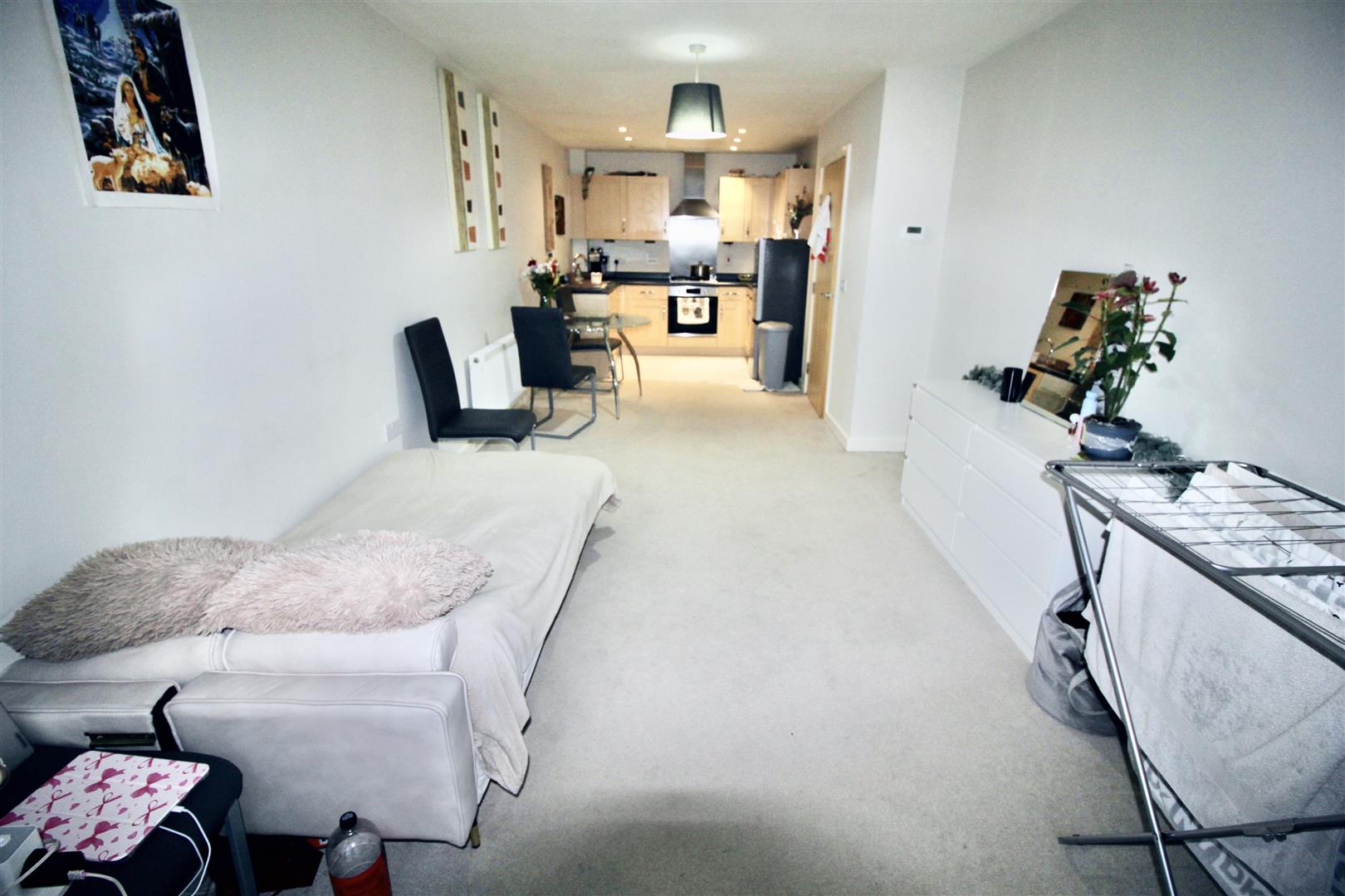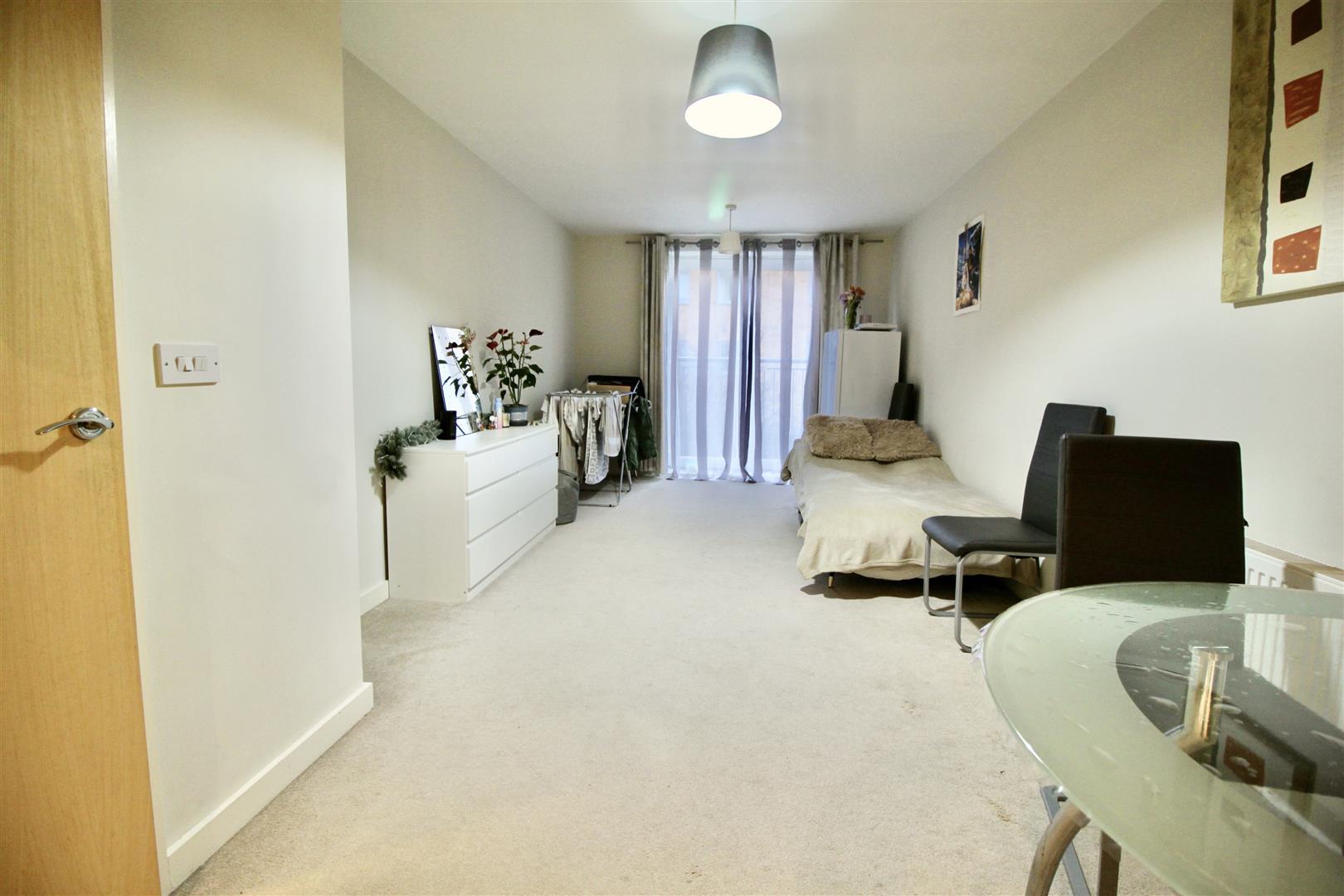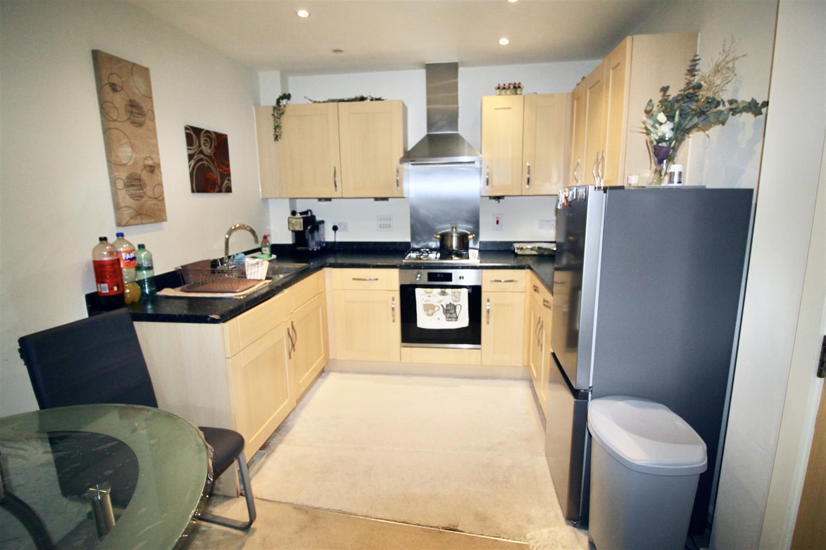 Modern kitchen with range of eye and base level units, work surfaces, built in electric oven with 4 ring gas hob, over head extractor hood, space for fridge / freezer, integrated washing machine and dishwasher, single drainer sink with mixer taps,, power points, tiled splash backs, double glazed double doors with Juliet balcony