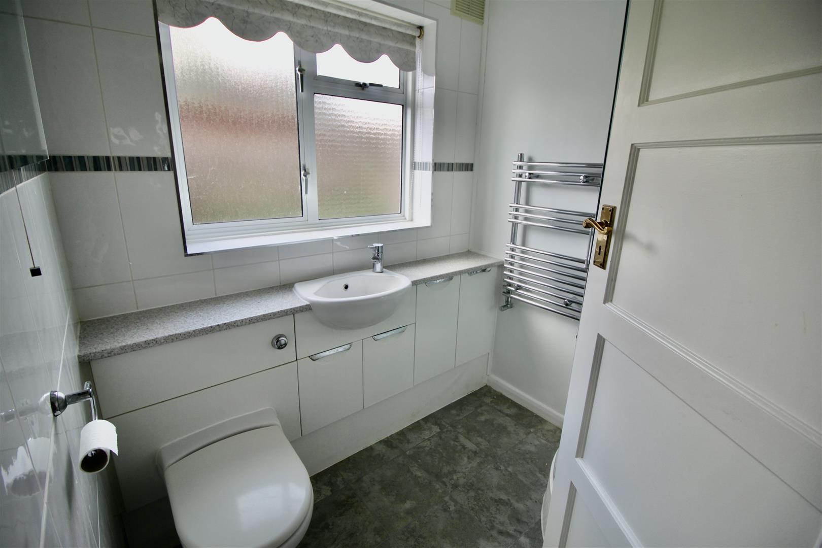 Window to rear, fully tiled corner shower, wall mounted chrome heated towel rail, vanity unit wash hand basin, close couple WC, fully tiled walls.