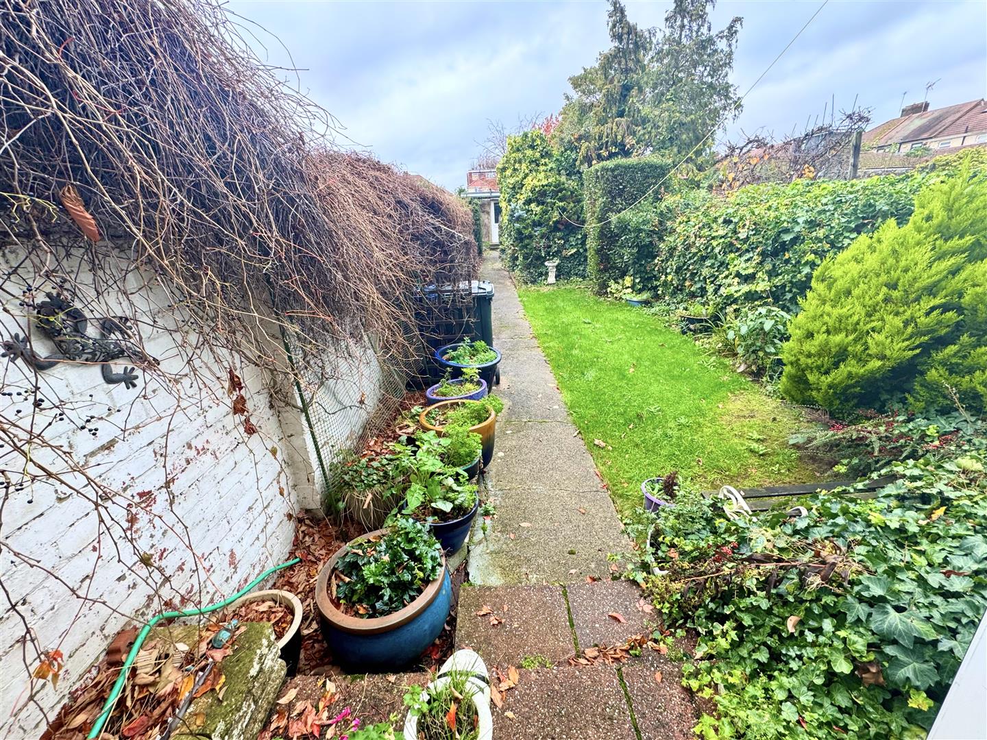 Mainly laid to lawn with variety of flower and shrubs, pathway leading to