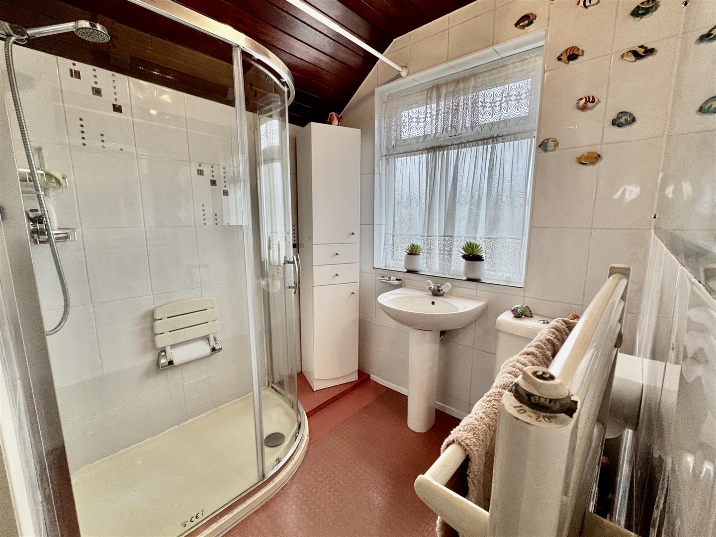 Fully tiled shower cubicle, mains shower, wash hand basin, low level wc, double glazed window to rear