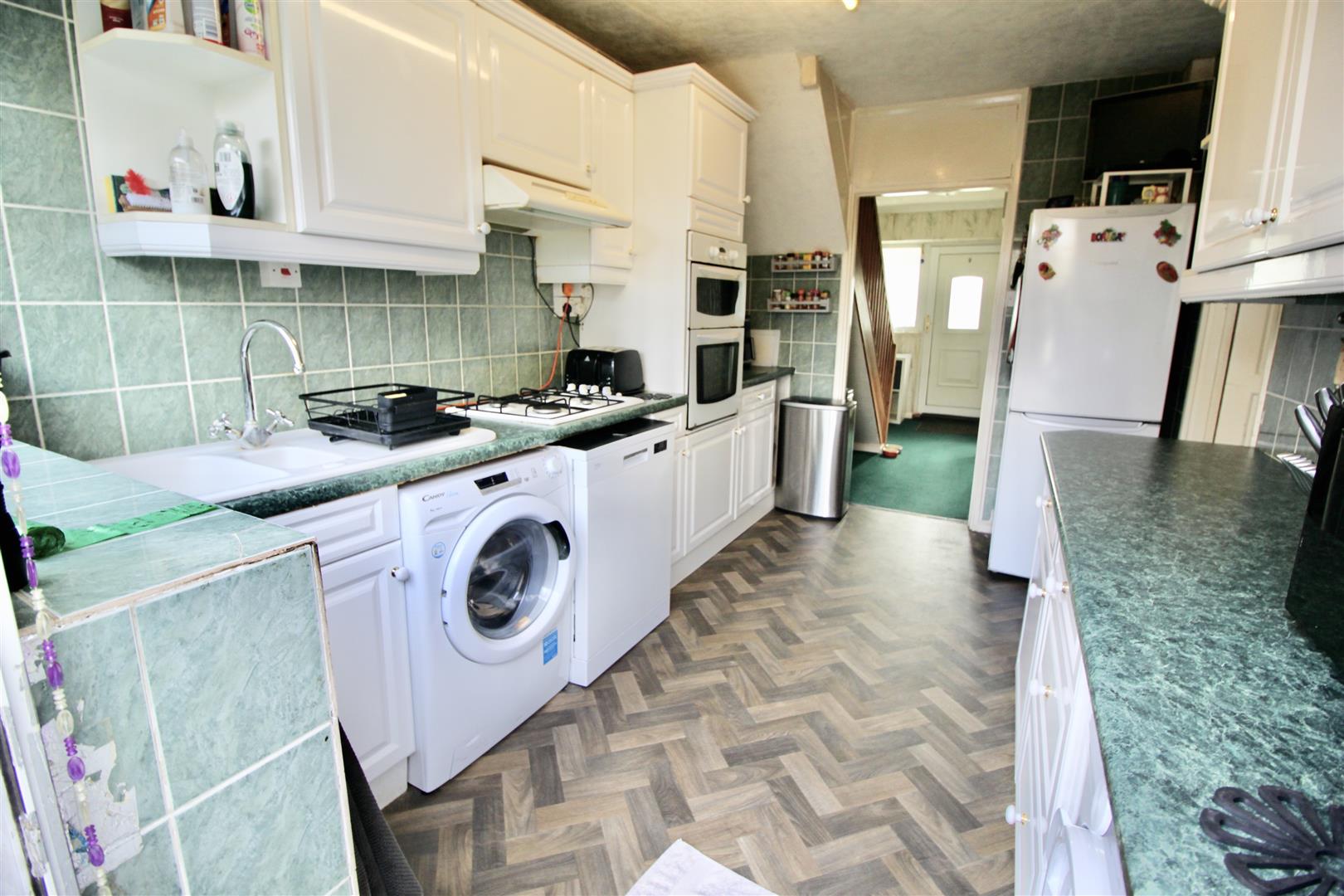Eye and base level storage units, built in gas oven & grill, gas hob inset into work surface, space and plumbing for washing machine, tiled walls, double glazed door to rear garden, door to