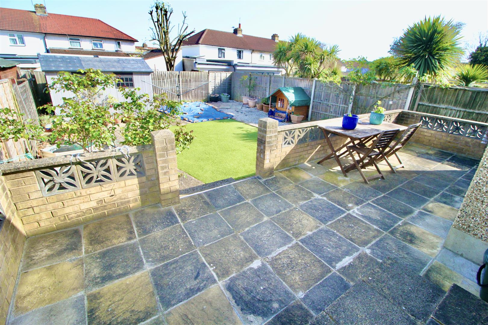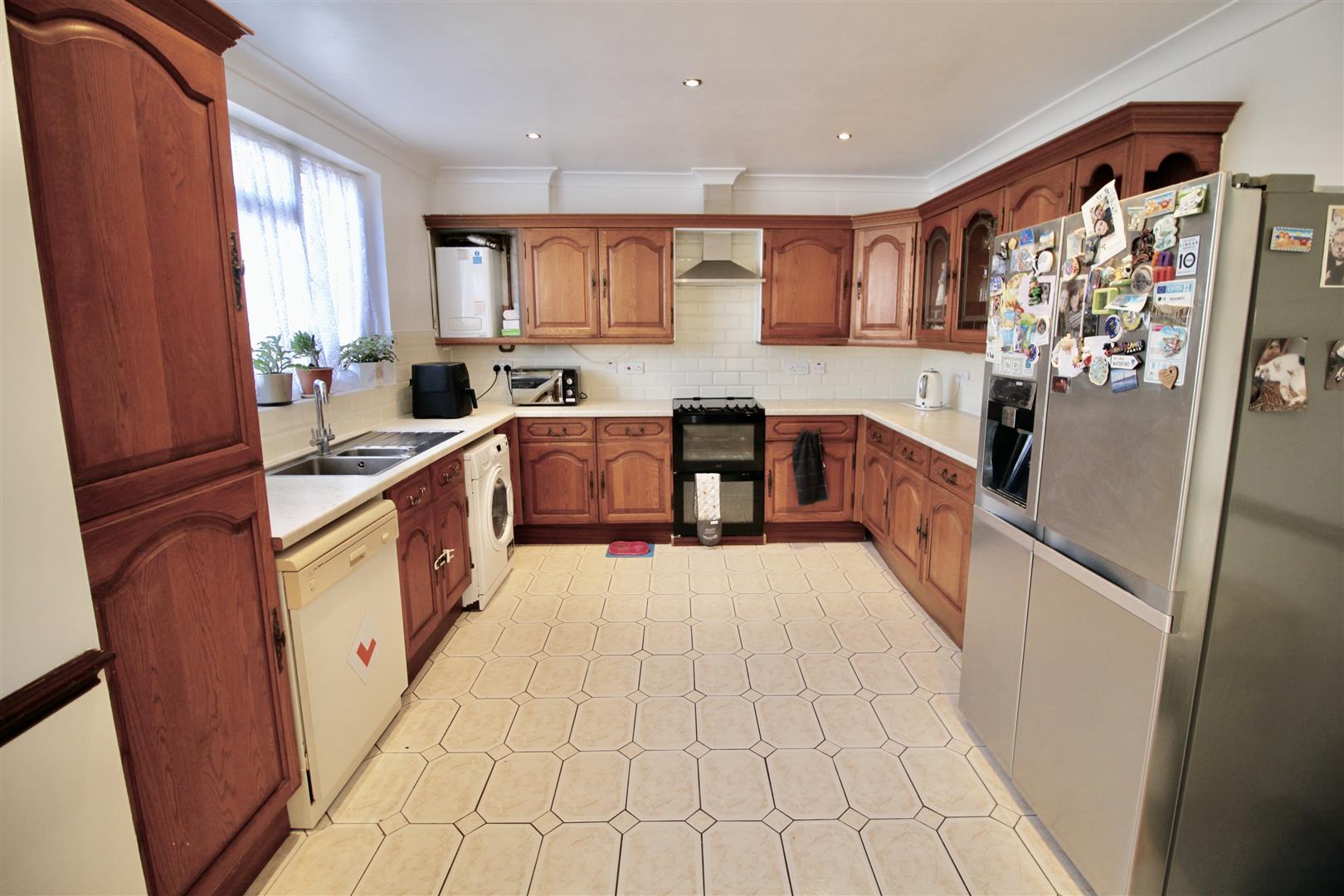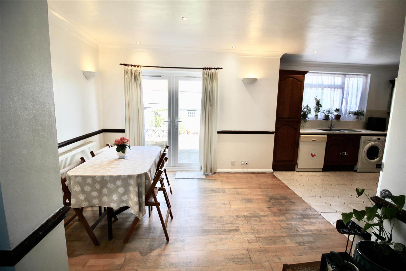 Eye and base level storage units, space for fridge/freezer, stainless steel sink unit, radiator, double glazed window and French door to rear garden.