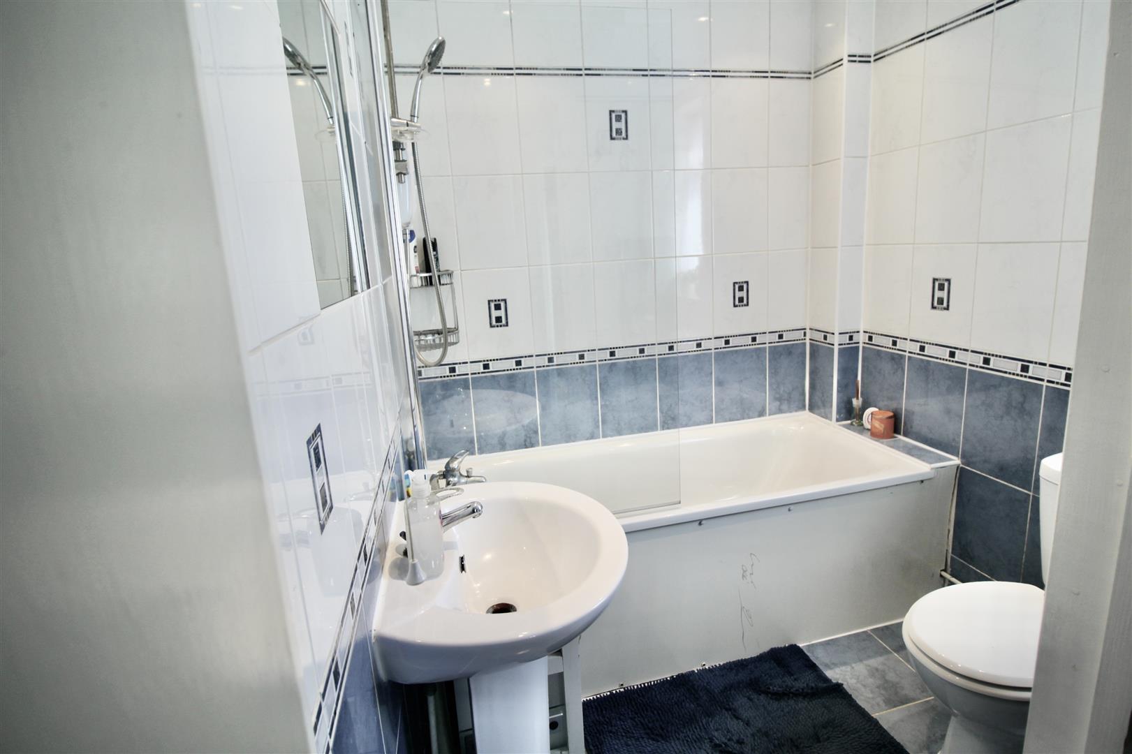 Panel enclosed bath, electric shower unit, low level wc, wash hand basin, tiled walls, double glazed window to side